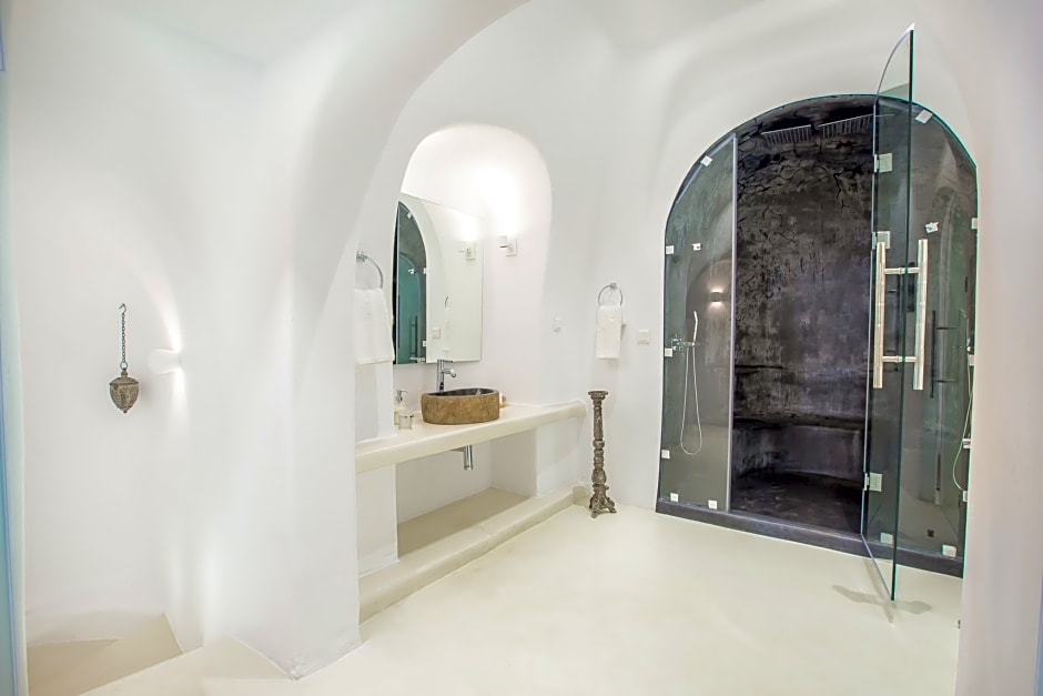 The Superior Suites are designed with stylish decorative details creating a delightful atmosphere. They feature a separate bedroom with one double bed and a living room with one single bed. The bathroom comes with large shower facilities with double rain showers. The private balcony offers breathtaking views of the Caldera, Aegean Sea and the volcano, while double loungers and sofas are provided